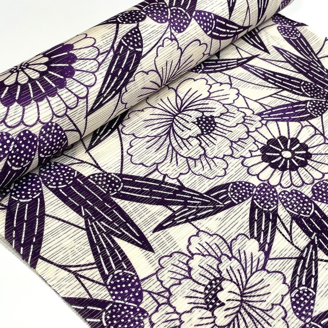 桜七軒 浴衣反物・白地に紫の牡丹、菊、笹